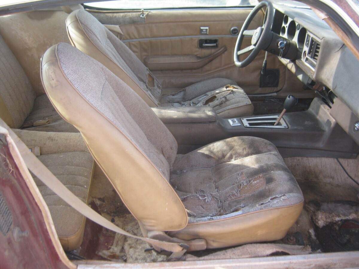 It was a well-equipped Camaro when new, with options including T-Tops, power windows and door locks, factory air conditioning, and so forth. Except for the empty spot under the hood, we’re told everything you see is original – the faded paint, decals, wheels, etc. While there is a little rust and a few dings here and there, the body is said to be reasonably solid. The seller can’t comment on the condition of the trunk as the lock is frozen and he/she can’t get it open. Besides putting in new power, a driveshaft and radiator will also have to be sourced.