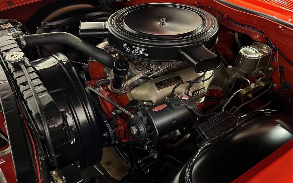 The factory tach is there, you can see the top of it, it is oriented about at the 10 o’clock position of the steering column. You can also see the factory Stewart Warner tach sending unit under the hood. The 3 gauges in the dash are also original they are a temp gauge, clock (if ordered) and a fuel gauge. The second belt goes around the crank, water pump and an idler pulley. As I mentioned in my above post, my friend Bill was a performance tech at a large MPLS/StPaul Chevy dealership beginning in the early 60s. He told me that Monday mornings after drag strip weekends the 409 cars would be lined up in front of the dealership, usually with blown clutches, trans or broken axles. The 409s generally held up pretty well but were really tough on the rest of the drive lines.