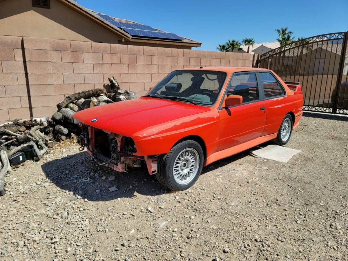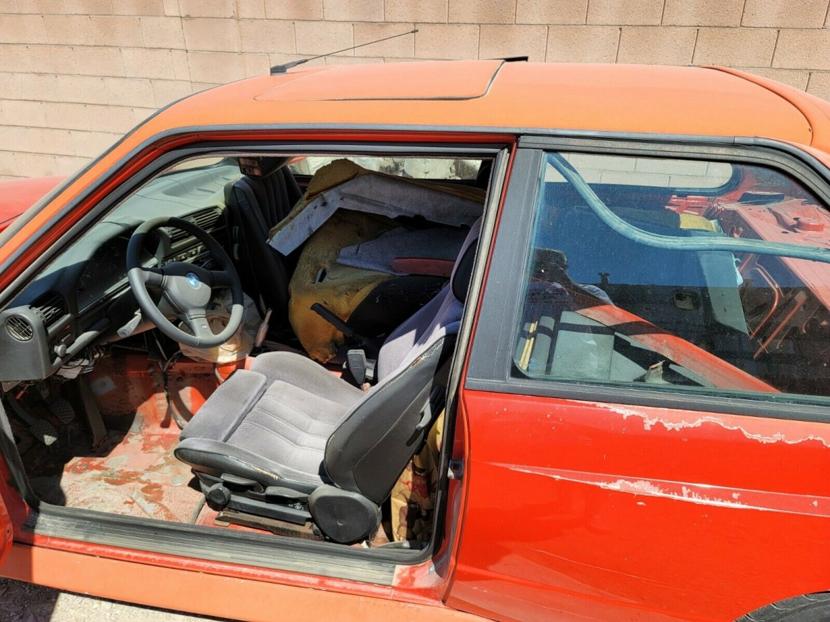 What’s truly a shame here is that the seller spent a few years hemming and hawing about what he should do with the car, leaving it outside in the relentless Arizona sun for the last few years of his ownership of the car, The interior was partially disassembled and the dash is of course completely cracked due to prolonged sun exposure. E30 M3s typically have leather seating surfaces, and it looks like the back seat has been removed and the cloth bucket seat dropped in place as a hold-over. The carpet has also been stripped out, but it looks like the foam padding is visible in the picture here, so perhaps it wasn’t tossed. The paint, as you can see, was never all that good, but has suffered further from years outdoors.