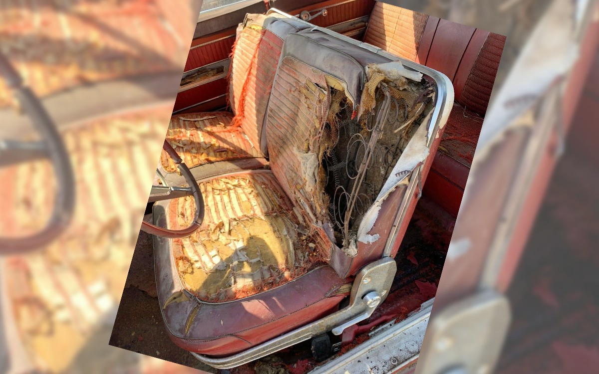 The interior looks as rough as the scales on a carp but anything can be fixed. There really isn’t an overall photo showing the driver’s side of the interior, other than a couple of close-ups, such as this one showing the gauges and a cracked dash pad. You can tell that the interior will need a total restoration, too. Hagerty is at $8,000 for a #4 fair condition car and this one is a long way from that. Their #2 excellent condition value is $16,100 and it would take a mackerel, I mean a miracle for this car to get back to excellent condition for that amount of money. This car appears to have a 3-speed manual with a column shifter, not the most sporty option but probably almost theft-proof in 2020.