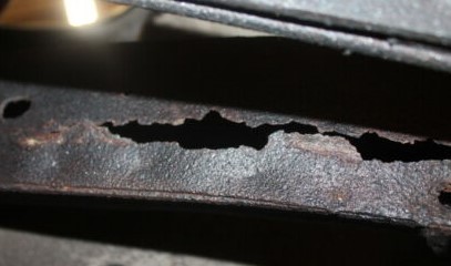That is the rear rail of the frame between the loop for the differential and the rear leaf support. No weep hole causes this not a large job. I am sure the other side is the same way. Studebaker international sells a rail for this around $100. A lot of labor cutting out lower the rear leaf grind, weld and paint. Shop charge for both sides less than $2k. If you can weld $200.