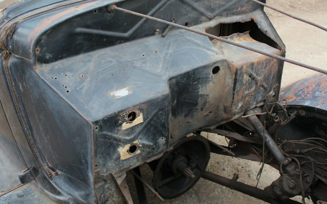 The seller mentions that this Ford does not have its original fenders and the ones in place are in rough shape. He further states that he would need another Ford to acquire the correct fenders. He does mention, however, that he has the bumpers and brackets. One of the neat features of this Ford is its rumble seat. I can’t imagine traveling a long distance at speed, packed into that small opening, but it is a great nod to the past automotive design. Unfortunately, the floor pan there will need attention too as it is showing signs of perforation. The folding top is present, but as would be expected, it needs to be replaced. The folding top frame is in place, however.