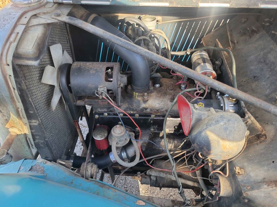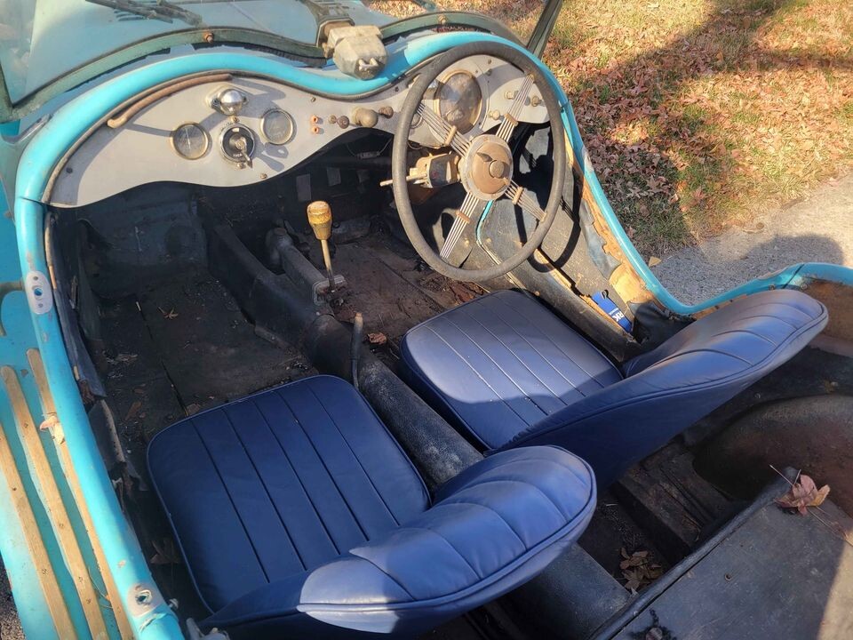 The interior shows the afterthought of a rear seat, barely more than a parcel shelf, and the gearshift, which is connected to the transmission using a series of levers. The soft top is missing and this car would have come with side curtains – the seller is mum on that score. He does indicate that the car has aluminum body panels and steel fenders. The use of aluminum would have been unusual, though Hillman did provide cars to a variety of coachbuilders in England. Note the asymmetrical cut in the doors: the driver’s side is deep for that rakish look.