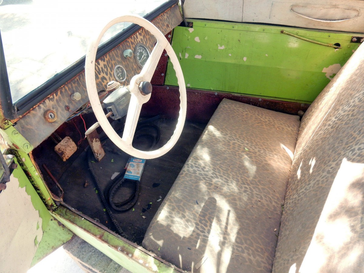 Leopard skin seats and dash! None of that or the lime green color can be factory correct but I love the lime green and I would restore it back to that color. I believe that this would have been a white car originally. An electric windshield wiper and washer, carpet, and even a radio were all optional in 1966. The seller says that this car has had one repaint back in 1970 and they have owned it since 1972.