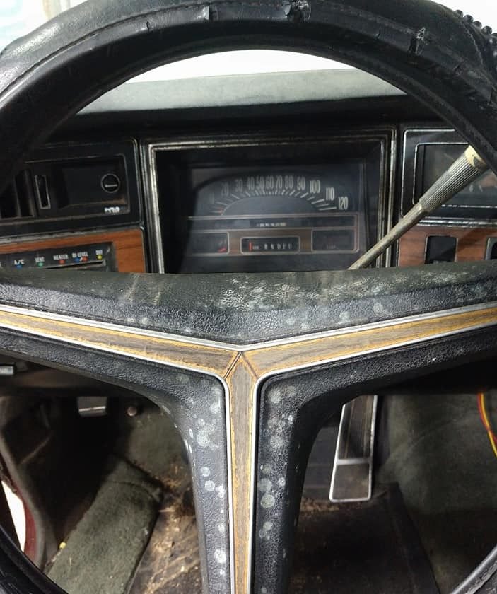 This car looks nice and straight and appears to have sat for a while, with its layer of dust and moldy steering wheel. The front seat base looks original, but the cloth upholstery it’s wearing is definitely not. It needs to go, as the original white Morrokide really pops against a dark exterior color. There is rust confessed to in the lower quarters, but unfortunately, we don’t get to see any pictures of it. The seller actually doesn’t give too much info at all, he claims “poor windows” but I think he means “power”.