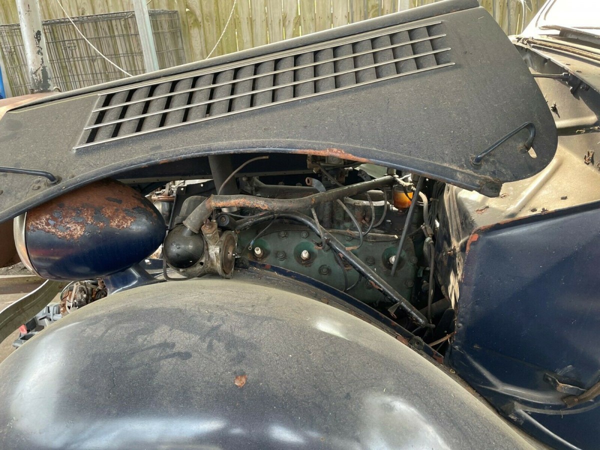 The interior is expectedly rough for a vehicle needing a full restoration, but it has a rumble seat! It looks to fold up and down, but it will need fabric and frame restoration. The seat bottoms inside the cabin appear to be missing, but the rest of the interior looks to be there. Floorboards, steering wheel, dashboard, door cards, pedals, shifter…everything.
