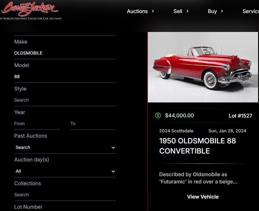 After WWII ended, the dash to purchase a new car was so overwhelming that no dealer had to do much except take orders: sales were hot even though the same old pre-war sheet metal was all that was on offer. A couple of years passed before new models truly proliferated. Oldsmobile got the jump on the Big Three when it launched its “Futuramic” line, starting with the top-shelf 98 in 1948. Penned by Art Ross, head of Oldsmobile’s styling studio, the Futuramic was hailed as “bringing truly functional design to the automotive field” – a strong assertion, particularly since Studebaker had planted its flag with a new, modern shape a year earlier. The company soon introduced the 88, and it, too, sported integrated fenders and sleek flanks. The tail still harkened to the “bustle” look, with a pronounced bulge before the sheet metal dove towards the bumper – the 98 with its longer wheelbase handled the trunk transition more gracefully. Here on eBay is a 1950 Oldsmobile 88 Futuramic convertible, with bidding at $12,600, reserve not met. The new owner can drive her home from Skokie, Illinois.