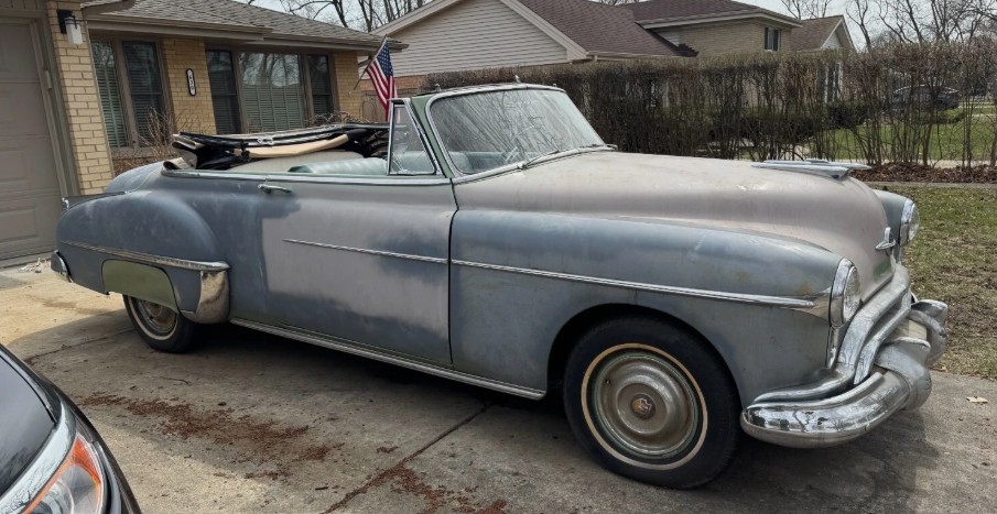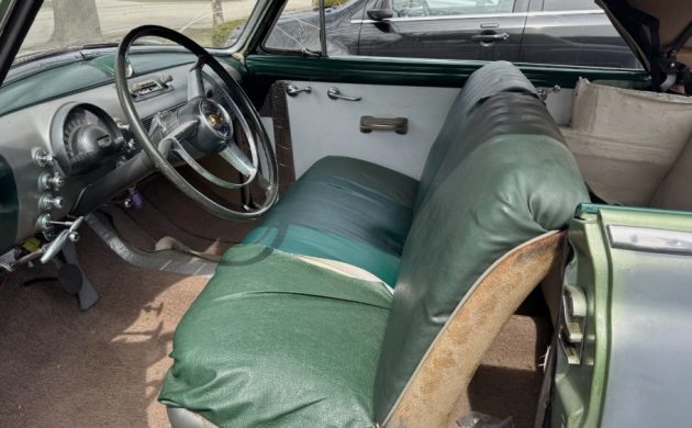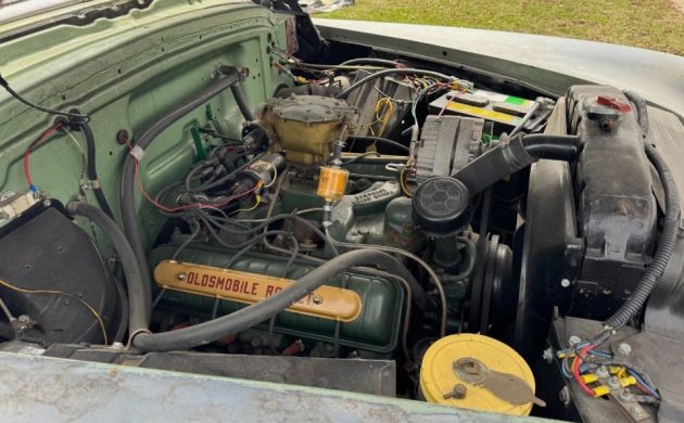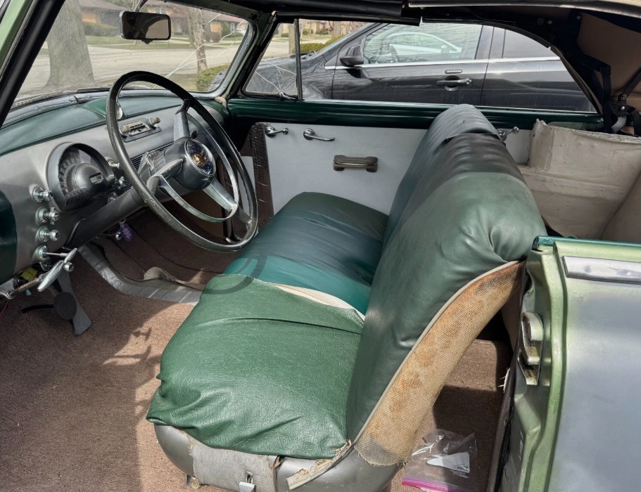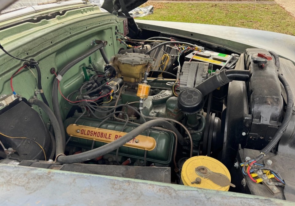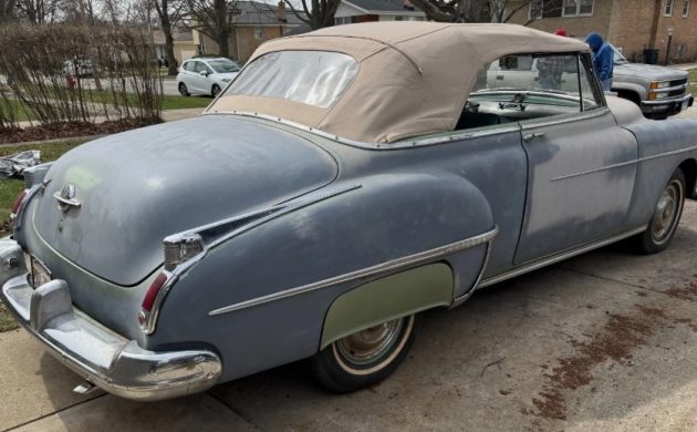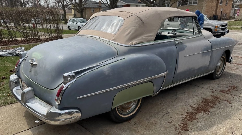 While this interior will need work, the basics are present – gauges, seats, steering wheel, trim, handles. Oldsmobile reminded customers that the 1950 Futuramic included a newly designed dash and controls, as well as a one-piece windshield. Just a year after this car was made, extra cost equipment included automatically adjustable seats and hydraulic window lifts – pretty advanced for the time. This car has the optional AM radio. The power top is said to work well, and the fabric remains decent. I would probably replace that rear window for safety’s sake.