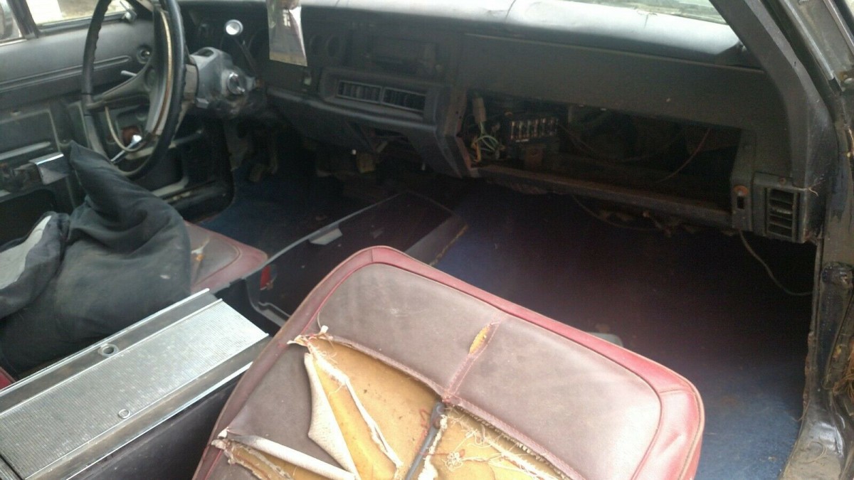 Blue Carpet, Red Seats, Blue Paint around the VIN tag and the right rear roof pillar has at least a 1/4″ bondo on it and cracked, The left side looks like it’s cracked also. Most likely had a vinyl top removed. The front bumper don’t fit at all, Doors don’t fit fenders don’t line up. NO rear side windows. This thing might have been painted Orange with a 01 on the door and did a few stunts back in the day. BUYER BEWARE