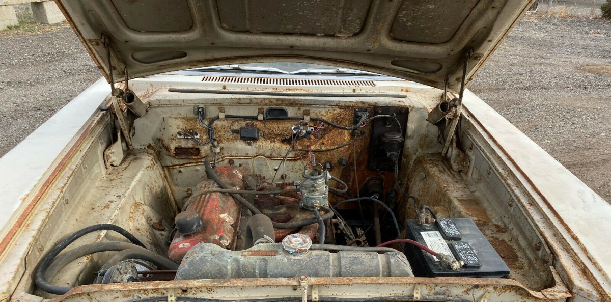 The interior is in rougher shape than the body, with the door panels and seats being ragged out. But the metal dashboard looks good and there is a rubber floor covering where carpeting would be in other models as standard equipment. The mileage of the car is unknown according to the seller. He provides a couple of videos to help prospects further review the car, as either a walkaround or running. Given the amount of work that is needed for such a basic car, the asking price sounds high. Would you restore the car and drop a Hemi in it for good measure?