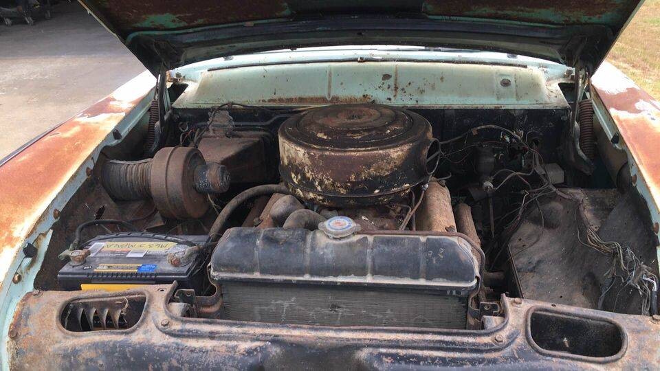 New for 1955 was the Fairlane as Ford’s top series, replacing the Crestline. At the top of the Fairlane leaderboard was the pillarless Victoria hardtop, the chrome-pillar Crown Victoria, and the Skyliner which was the latter with a transparent “skylighted” top. They would build 113,000, 33,000, and 2,000 copies, respectively. The seller’s car is the steel roof Crown Vic with a V8 engine, which could be either a 272 cubic inch edition or the larger 292 motor borrowed from the Thunderbird. We can’t make out which from the photo provided.