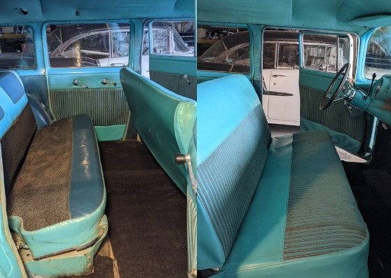 The seller’s ’57 Bel Air wagon will need more than its fair share of cosmetic work, although rust doesn’t seem overwhelmingly present. The main concerns might be the floorboards given the condition of the deteriorating carpeting which has to make you wonder what’s down below. There are a few dings and dents in the sheet metal and chrome pieces and the turquoise/white two-tone paint is nice to look at, from 20 feet away. The interior will require a complete restoration, especially the dashboard as this one is thoroughly baked. The door panels are falling apart, and the carpeting is toast. The storage area will need attention with both fabric and paint and the windshield appears cracked.