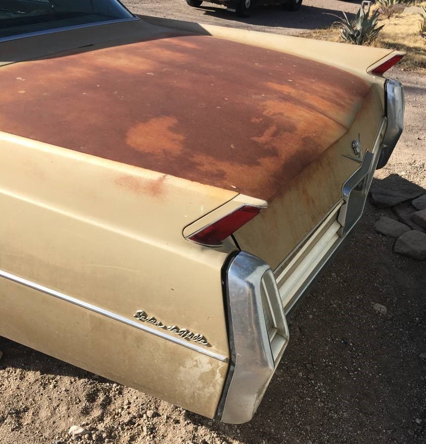Cadillacs were known for being built like tanks, so this one has held up reasonably well. The original gold paint is still present, but tired. The sheet metal is straight but there are a few dents and dings here and there as well as some surface rust (perhaps more than patina). Most of the original exterior trim is present and the driver’s side fender skirt is in the trunk. The hood has a badly adjusted hinge that will need proper alignment for it to close tight.