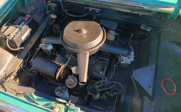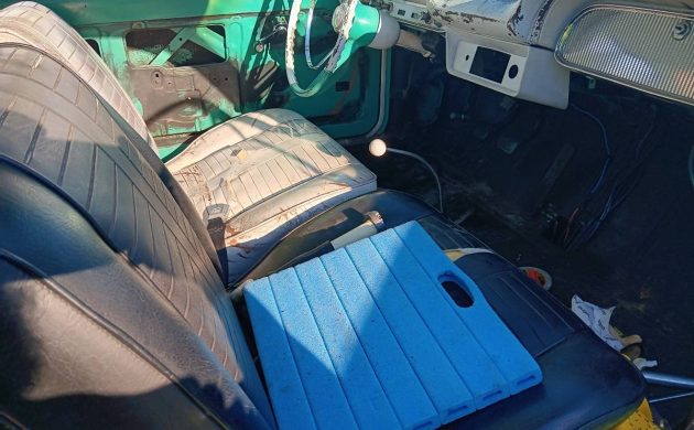 We’re told this Chevy runs, drives, and stops thanks to new brakes and rebuilt carburetors (2?). So, perhaps the remaining issues are cosmetic-related. The interior is going to need a refresh, and the body has rust, particularly in the doors, rocker panels, and heater channels. We wonder if the original color of the lower half of the exterior was white, and the turquoise was a switch. The underside of the hood is white, yet one of the insides of the doors and steering column has been painted to match.