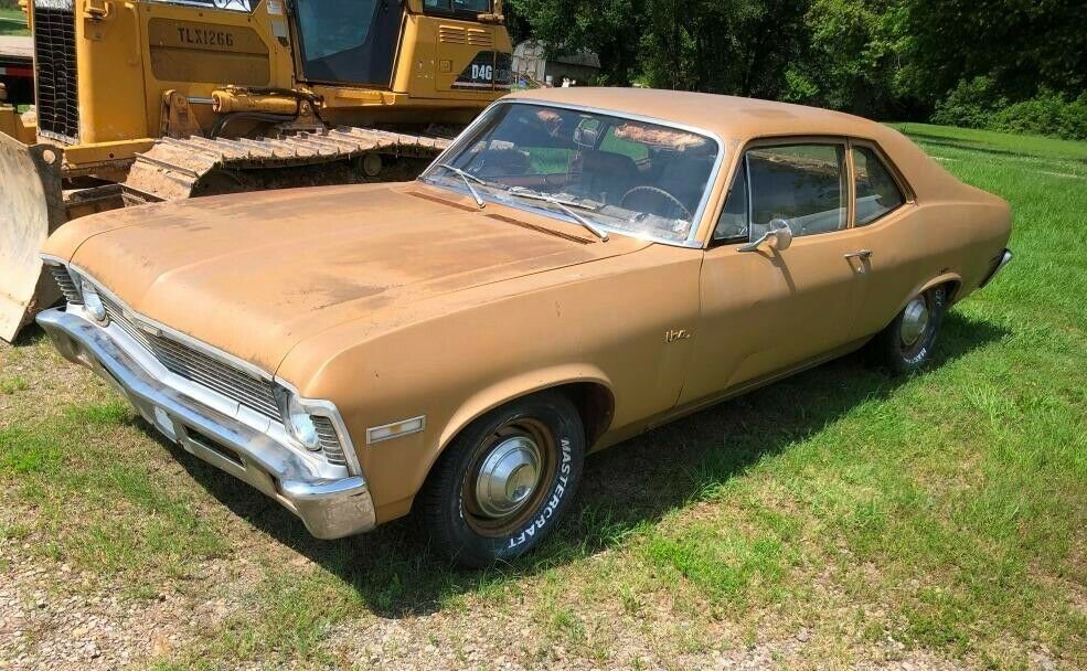 The year was 1991. I bought a 1970 Nova 250 at a farm near the parents place. We had to run a hose through a hole in the floor to the fuel pump to get it fired up. When I drove it out of the hole it had sunk into, the fuel tank remained there. This turd had no brakes and there was no chance the parking brake was going to be of use. So off we go down the road thinking I could slow this down by using the THM 350. When coming to a stop sign the transmission decided to loose line pressure and there was no slowing down. My friend opens the door to bail and I convinced him to stay as we were above 30 MPH. We took the car around the hard left turn with the passenger door still wide open and then the line pressure returned and we were good to go. Last time he helped me with any field car finds… When I dragged this to the wreckers an hour from my parents, the only thing keeping the rear of the car from dragging down the road was the trunk lid restraining the leaf springs from going any higher. Gotta love Ontario!
