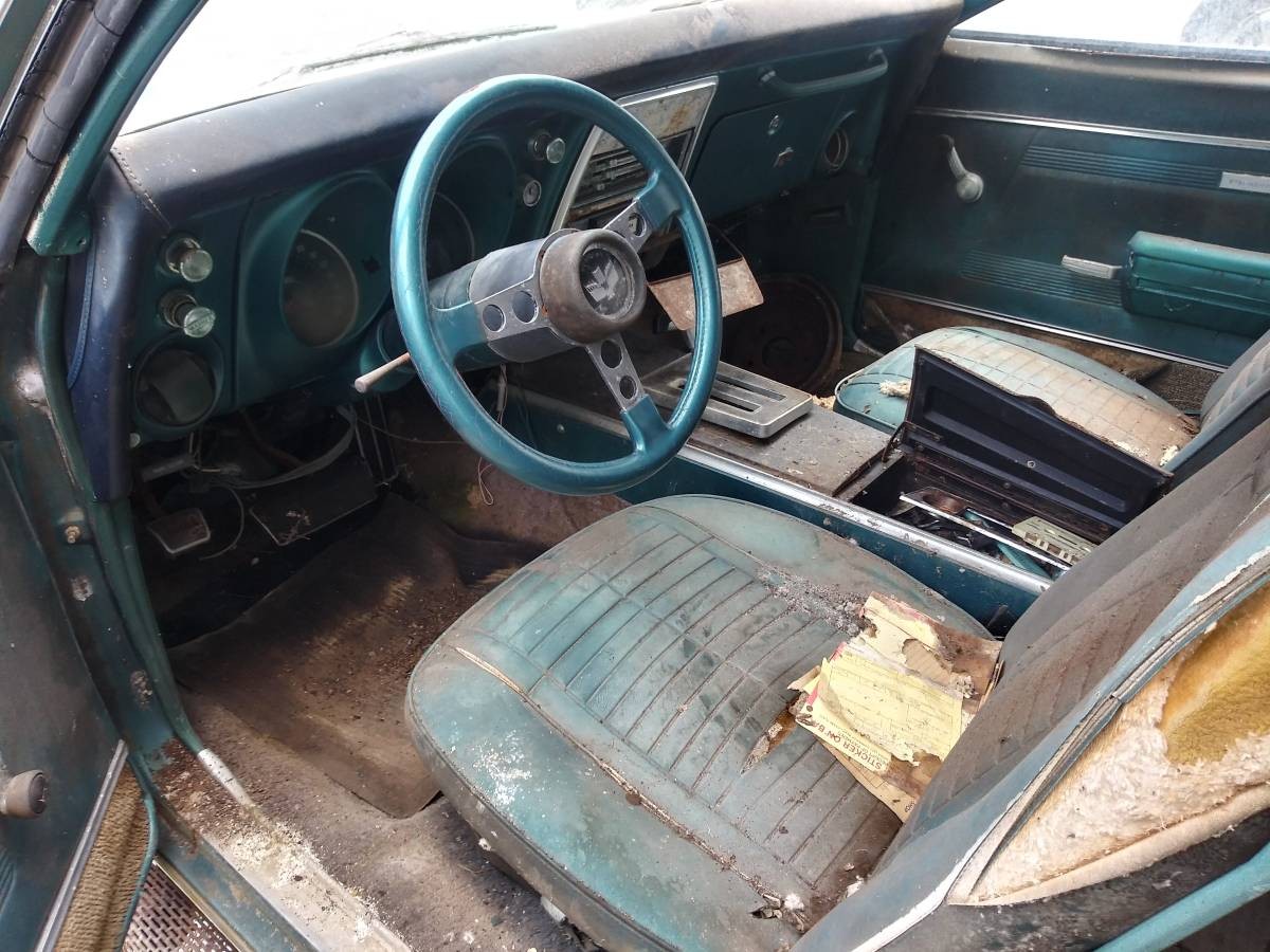 The most visible changes in the Firebird for ’68 were the loss of opening vent windows (replaced by flow-thru ventilation) and the addition of Federally-mandated side marker lights. The basic Firebird had a 250 cubic inch six, but that motor is long gone in this car. A YJ 350 V8 with #17 heads is there now and we’re told it runs, but we’re not sure how or how well. It’s paired with a TH-400 automatic transmission. But don’t let that mislead you as the car will have to be towed to its next domicile.