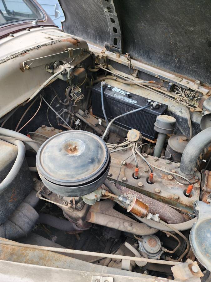 The “Super Eight” nomenclature became confusing, as Packard gyrated between long and short wheelbases and later shifted from the Clipper model name back to Super Eight. The first Super Eights were full sized cars in the luxury tradition, but were swiftly downsized. After WWII, the company was selling versions of its ponton-styled Clipper, which it then renamed the Super Eight. Common to all was an L-head straight-eight engine. In 1948, the engine displaced 327 cu. in. and breathed through a two-barrel Carter carburetor. With a 7:1 compression ratio, output was rated at about 145 hp. The transmission is a column-shift three-speed manual. This car runs, drives, and stops, but has a hole in the radiator begging for a fix. The battery is new and the car is registered through this year.