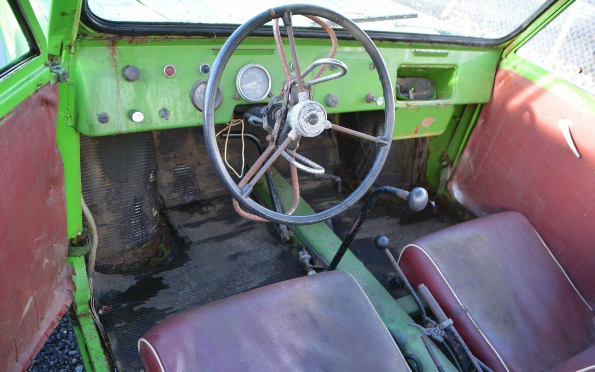 See, no pedals. There are some unusual controls here, but these cars really did serve a purpose in allowing folks who couldn’t use their legs to get around. They weren’t sold but were leased to those folks and were supposed to be turned back in, but quite a few of them were somehow registered as private vehicles, and a lot of them seem to have ended up in Great Britain. The Brits had their own version, the Invacar, but there’s something cool about a Soviet-era vehicle like this. As far as restoring this car, the seats look good, but I’d want to redo them and the door panels, not to mention the headliner, which has a weird dark spot above where the driver’s head would have been.