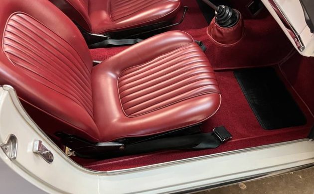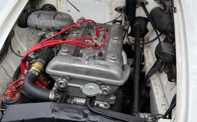 It wouldn’t be an Alfa if the engine weren’t as gorgeous as the rest of the car, and here we have their famous double-overhead-cam 1300cc four, producing 79 horsepower in standard trim (some sources say 80). The seller has installed a new Weber two-barrel carburetor, and a previous owner had installed new wheel cylinders and stainless brake lines (yes, the Giulietta has four-wheel aluminum drum brakes). It also has a new radiator, water pump, and Abarth exhaust system.