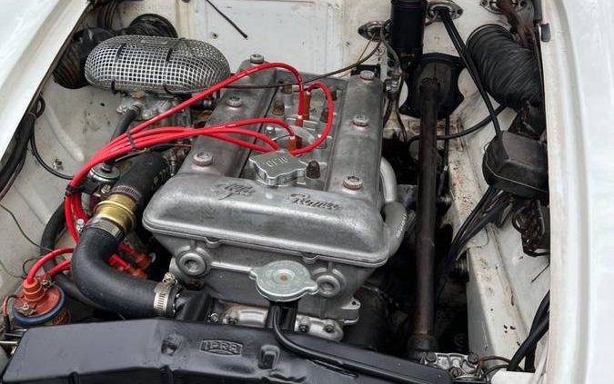 In the Normale version, it was a single SOLEX downdraft, In the Veloce version, there were two WEBER 40DCOE side-draft carbs.(or were they 45DCOE – I forget), To accomodate the WEBER carbs, Alfa had to cant the engine several degrees toward the driver’s side, which did not leave enough room for the standard LUCAS generator, so they instead fitted a smaller MARELLI generator, which was made of unobtanium. I had a twin of this car and a 1960 Veloce Coupe. and a few others. All bought used and none in anywhere near as nice condition.