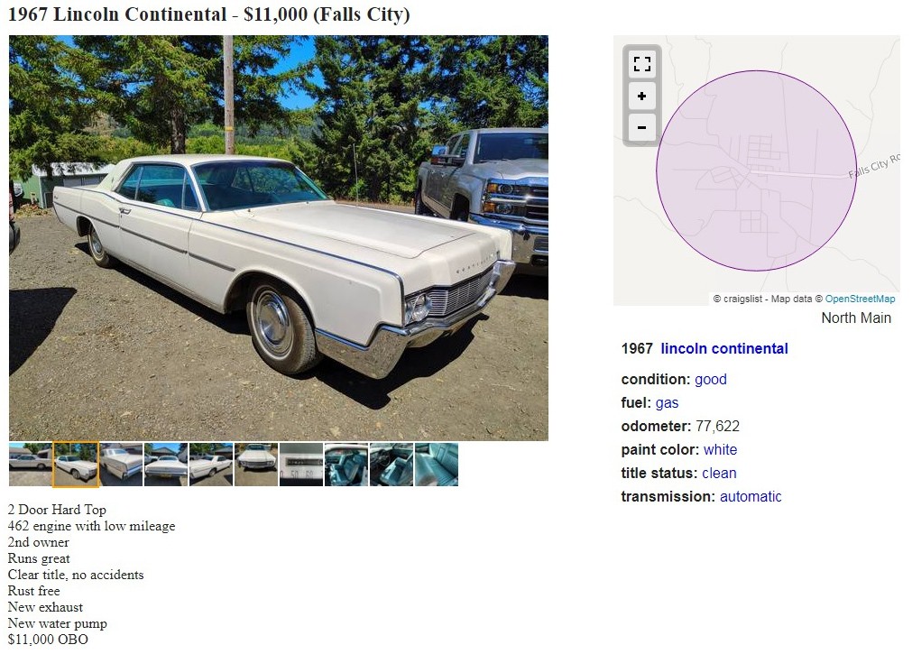 Memories, like the something something of your mind… Some of you may remember that I had a similar car, but a year older and dark green. It’s one car that I regret selling, but they are not small, they require a longer, easier-to-get-into garage space than we had, so I was paying storage fees. The seller has this 1967 Lincoln Continental Coupe posted here on craigslist in Falls City, and they’re asking $11,000. Here is the original listing, and thanks to Curvette for the tip!