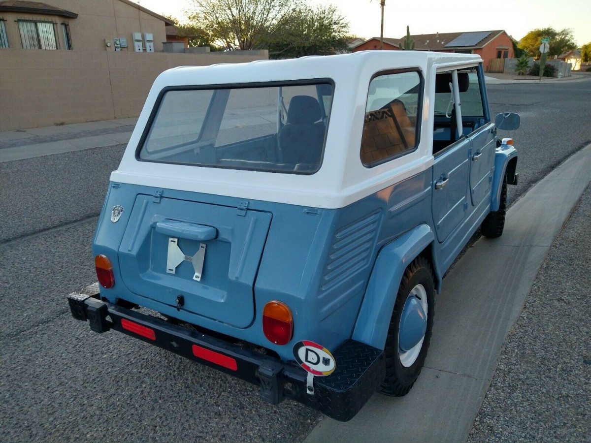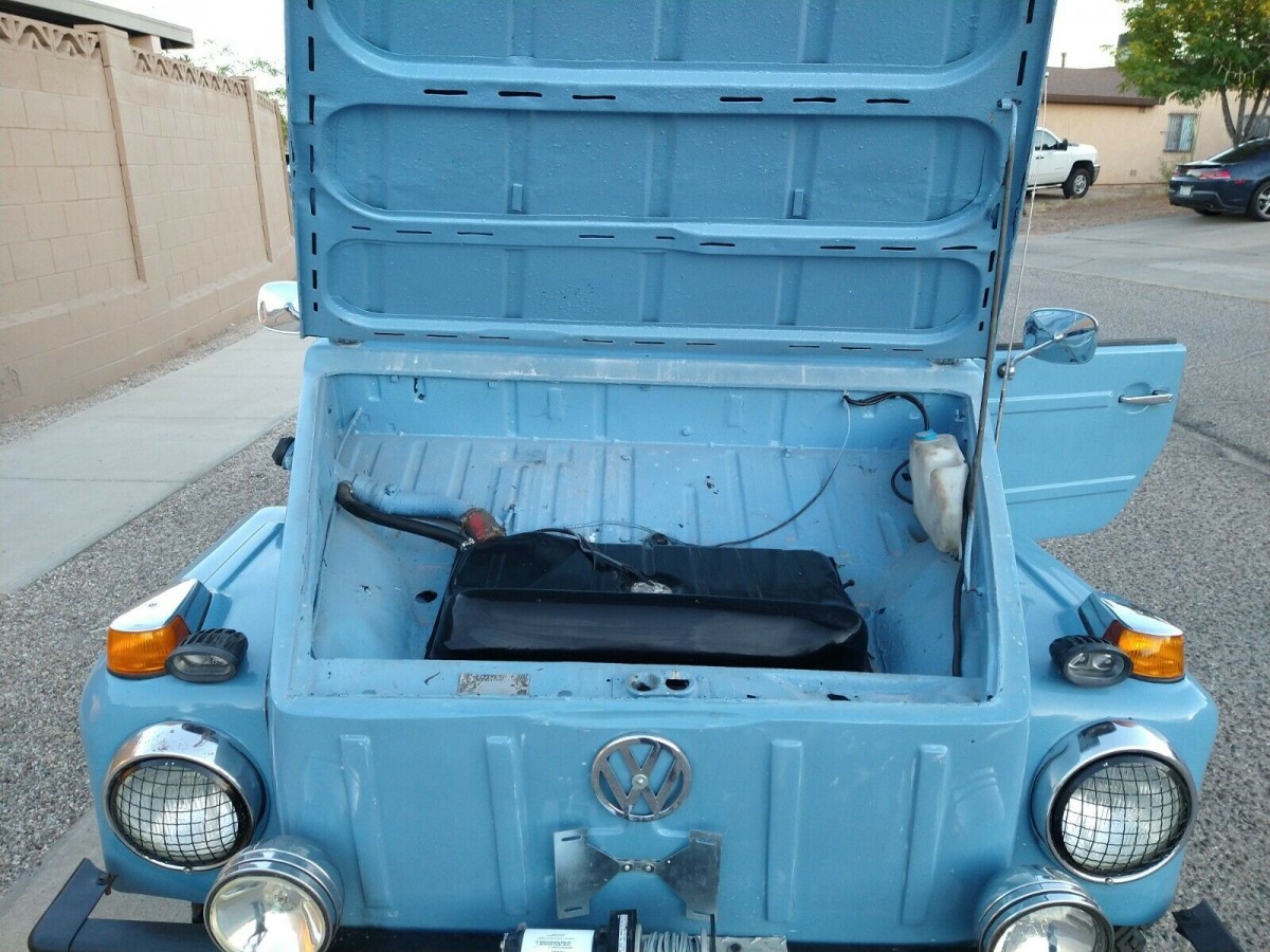 When I look in the frunk I see a missing gas heater. US cars got that for 73 only. This one also has electronic ignition from a later Beetle. It’s also cool to see the small tail lamps we never saw in our country. As far as color they made a special edition that was painted blue and white and had matching top and interior in blue and white. Just can’t remember what they called it. My dad wanted me to get a Thing for my first car when I was in HS. Back then I didn’t want to get caught driving my thing or playing with my thing or working on my thing. I wanted a 67 Firebird like my friend had.