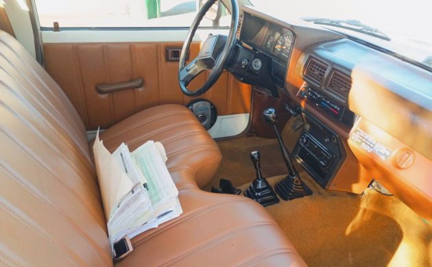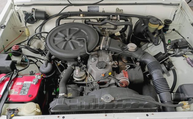 Are the air cleaner and the top of the radiator coated with the same material as the underside? This is Toyota’s 22R, a 2.4-liter SOHC carburetor-equipped inline-four with around 100 horsepower and 128 lb-ft of torque when new. Backed by an RF1A 2-speed (plus neutral) gear-driven transfer case and a 5-speed manual, sending power to all four wheels as needed, the seller says it’s been well-maintained and runs perfectly. Hagerty is just over $13,000 for a #3 good-condition truck, how much would you pay for this one?
