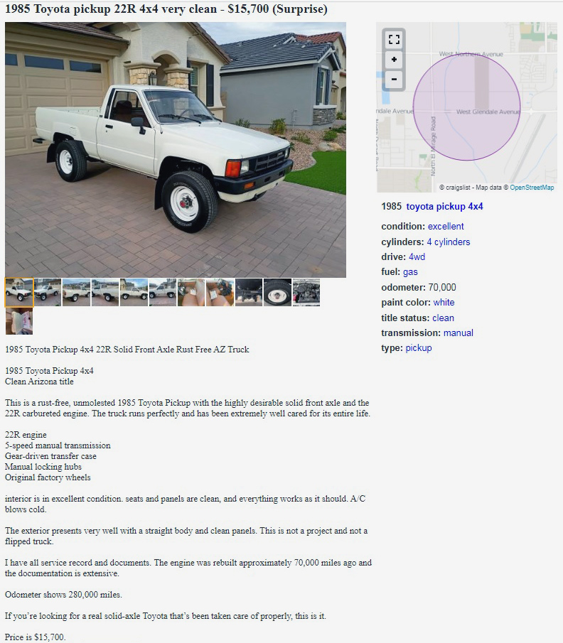One thing pointed out in the CL listing (but I don’t see mentioned here) is the (coveted by many) solid front axle in these models. It may not ride as good as the independent ones that came soon after this, but I’d rather have this bulletproof setup for myself. 22R engine, solid front axle 4×4, clean, near perfect truck, what’s not to like?