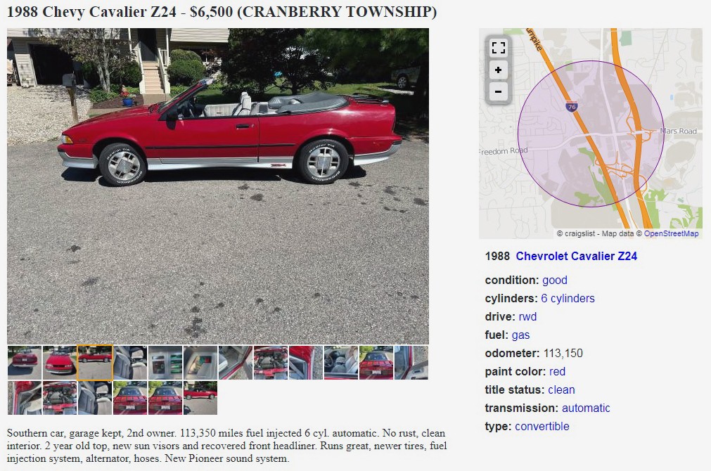 “Lit-tle red Cavalier…” Ok, that doesn’t roll off the tongue like Little Red Corvette (Prince song), but if you have champagne taste on a cider budget, check out this 1988 Chevrolet Cavalier Z24 Convertible; it looks like a top-ten hit. The seller has it posted here on craigslist in Cranberry Township, Pennsylvania, and they’re asking $6,500. Here is the original listing, and thanks to Mitchell G. for the tip!