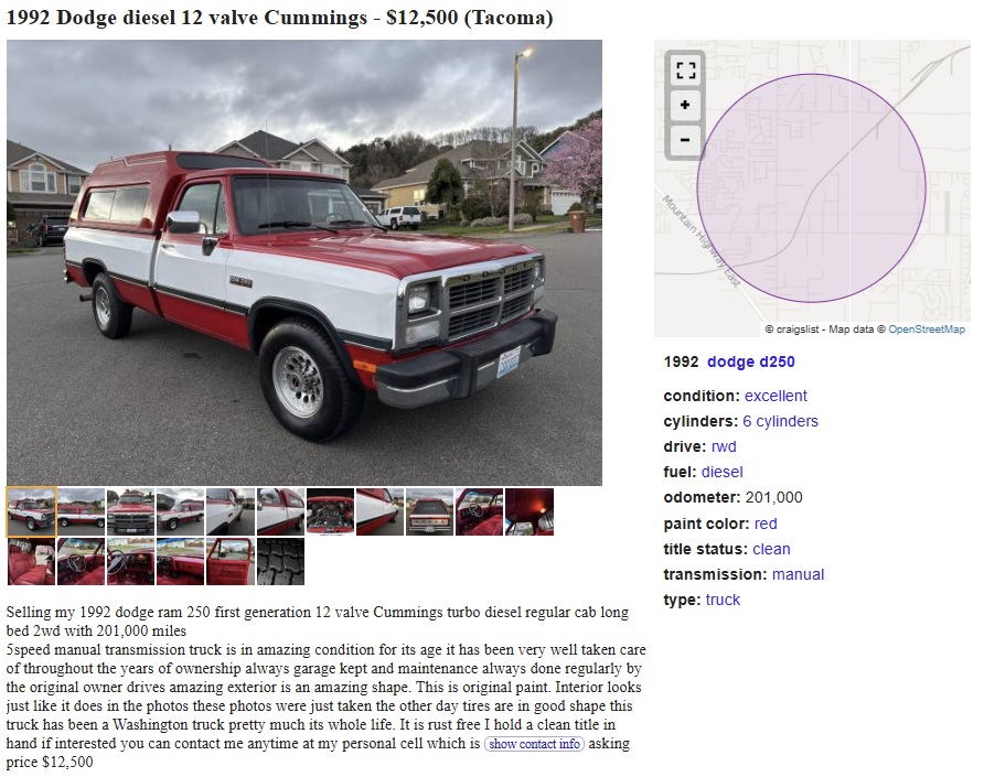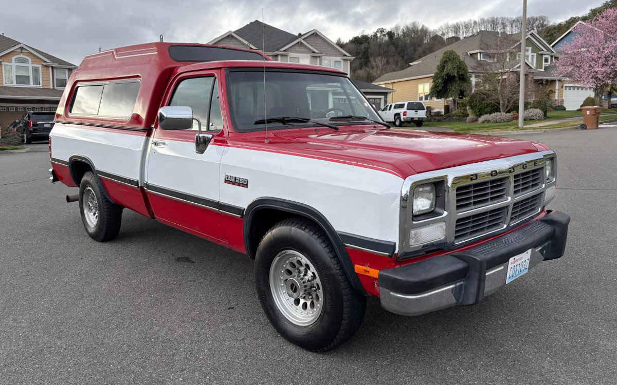 I’ll try not to say this 1992 Dodge Ram 250 diesel 5-speed is a box-checker as often as I usually do when a diesel truck with a manual transmission comes up for sale. This one is rear-wheel drive, so the 4×4 box wasn’t checked. The seller has it posted here on craiglist in Tacoma, Washington, and they’re asking $12,500. Here is the original listing, and thanks to Curvette for the tip!