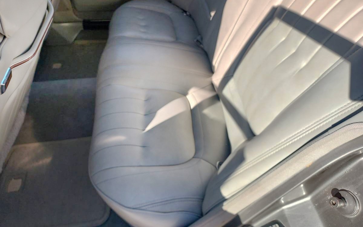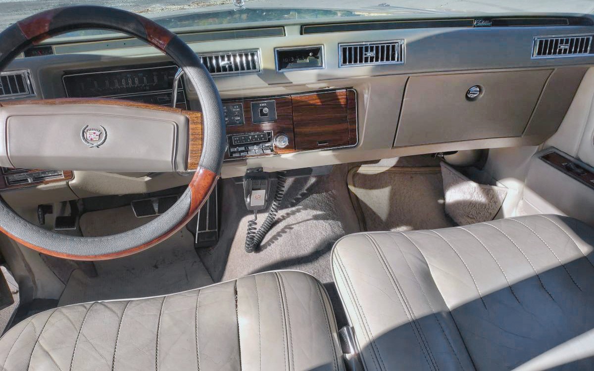And, here’s the California sun damage. So while that climate appears to have preserved the sheet metal, it’s done a number on the soft surfaces, or some of them, like the leather seating. It could just be regular wear on the driver’s seat bottom as the back seat looks perfect. And as always, we don’t know if the steering wheel cover is hiding damage or protecting a perfect wheel. The interior looks great overall, it’s just the driver’s leather seat bottom. And, this car has a CB radio and 8-track player; very retro cool!