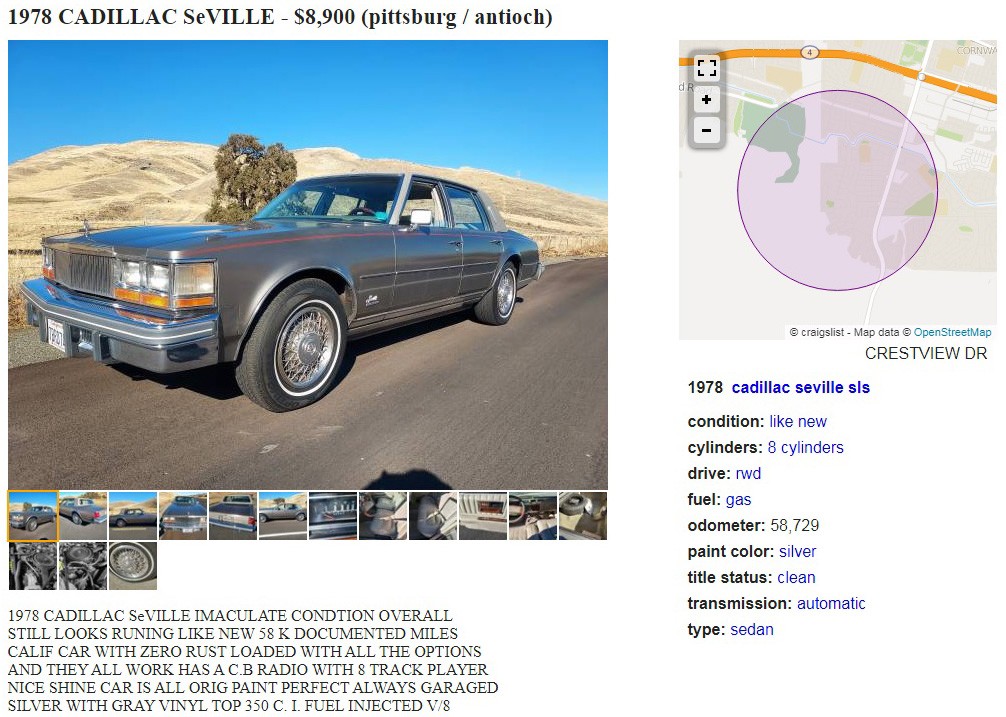 Despite being a shorter Cadillac, the front was still too long for the photo above. The rolling landscape is a great spot for photos and the seller has provided some good ones overall, especially for a craigslist ad. The first-generation Seville was made in 1975 for the 1976 model year through the 1979 model year here and this was it for body styles, so you two-doors-too-many folks will have to do with a two-door Photoshop version I made a couple of years ago here.