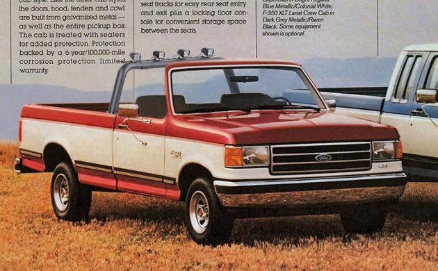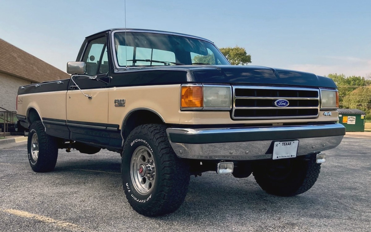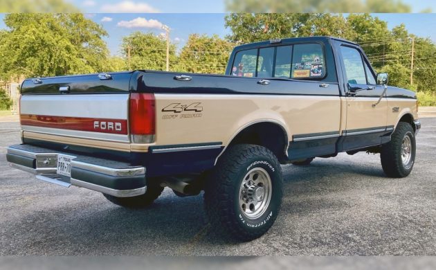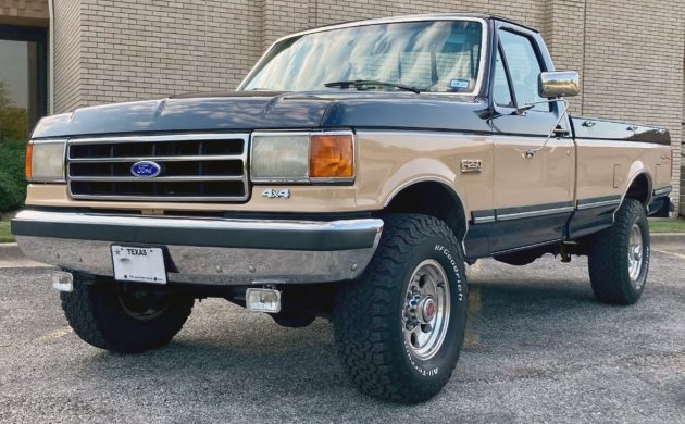 The aero headlights are a dead giveaway to spot an eighth-generation F-Series pickup. They were made from 1986 through 1991 here, and the seller says this 3/4-ton 4×4 is wearing newer Deep Shadow Blue paint, but the Desert Tan Metallic paint is original. I’m guessing the top half was repainted due to 34 years of living in the hot Texas sun, as there is reportedly no rust on this truck.