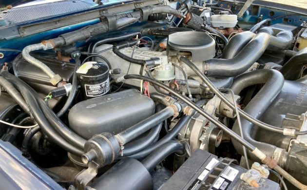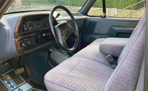 I believe this seat color is Crystal Blue, but it sure looks faded, unless that’s just a trick of light and/or shadow. The rest of the interior is blue, and you can see the column selector for the automatic transmission in this truck. A lot of them that we’ve seen lately have been manual transmissions, but this one isn’t. The good news is that they say the transmission and torque converter have been rebuilt, along with flushing the lines. The air-conditioning is said to be ice cold, and the only issue, other than an intermittent ABS light, which is possibly due to a replaced NOS Motorcraft “computer,” is that the passenger window sometimes goes on strike.