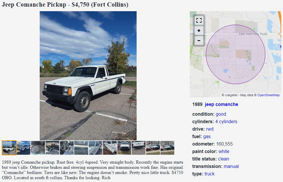 I’m not sure why I always think a Jeep has to have 4WD. It’s like seeing a hardtop version of a car that you normally see as a convertible, and it just seems strange. Jeep is just so well-known for having all four wheels churning. The seller has this rust-free 1989 Jeep Comanche posted here on craigslist in Fort Collins, Colorado, and they’re asking $4,750 or best offer. Here is the original listing, and thanks to Rocco B. for the tip!