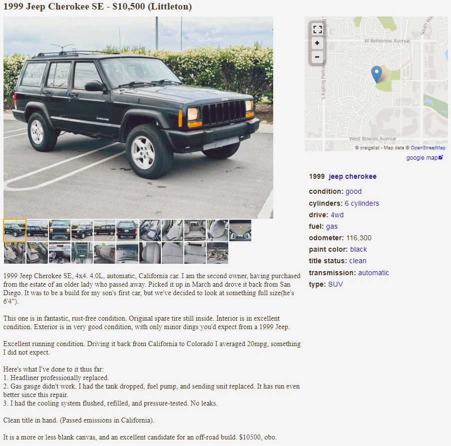 Jeep’s marketing department went all out when it named this color “Black”, compared to the flowery, fancy names for its other colors: Desert Sand Pearl Coat, Flame Red, Forest Green Pearl Coat, Deep Amethyst Pearl Coat, and you get the idea. Even “white” was named “Stone White”, so why did the color Black get gypped on a fancy name? This 1999 Jeep Cherokee SE is posted here on craigslist in Littleton, Colorado, and the seller is asking $10,500. Here is the original listing, and thanks to Tony P. for the tip!