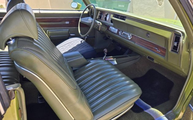At first glance, it appears that the driver’s seat doesn’t match the rest of the nearly pristine interior, but that is an optical illusion; there is a temporary seat cover to protect what may be the original upholstery. The bucket seats are listed as standard on the Supreme, as is the wood grain vinyl instrument panel trim, but this car also has a console and floor shift for the automatic. I know that green is a polarizing color on old cars, but I fall firmly in the pro-green camp; in fact, it’s completely possible that this would be the exact car I’d order if I were alive in 1971 and wandered into the Oldsmobile showroom.