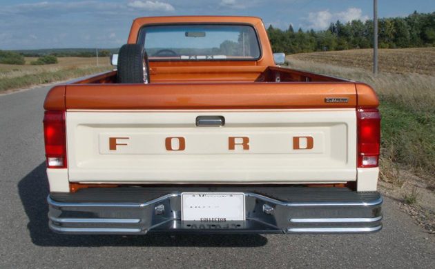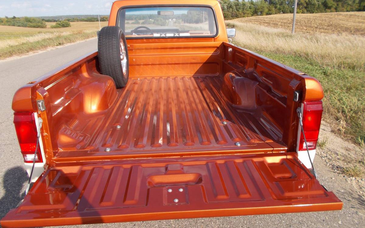 This truck looks ready for Pebble Beach. Our friend, Bob_in_TN, is a Concours Mustang judge, and he knows a lot about Fords, in general, too. Bob and the other Ford experts here may be able to pick out details that aren’t 100% factory-correct. This one is wearing Ford Ranger’s “Deluxe Two-Tone Paint” in colors that I don’t see in Ranger brochures, but the seller says they’re Ford colors. I don’t see “Cream” on this Ford paint listing, but Ember appears to be from a 1978 Ford. Whatever Ford they’re from, they’re beautiful, as was the condition of this Ranger before it was repainted, according to the seller. Here’s what the bed looks like.