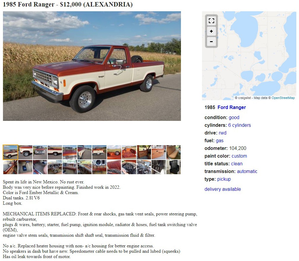 Wow, this is one nice Ranger! Just to get it out of the way right off the bat, yes, it’s been repainted, but it’s said to be a rust-free New Mexico truck, and someone spent a ton of money on this little hauler to make it this nice. The seller has this 1985 Ford Ranger posted here on craigslist in Alexandria, Minnesota, and they’re asking $12,000. Here is the original listing.