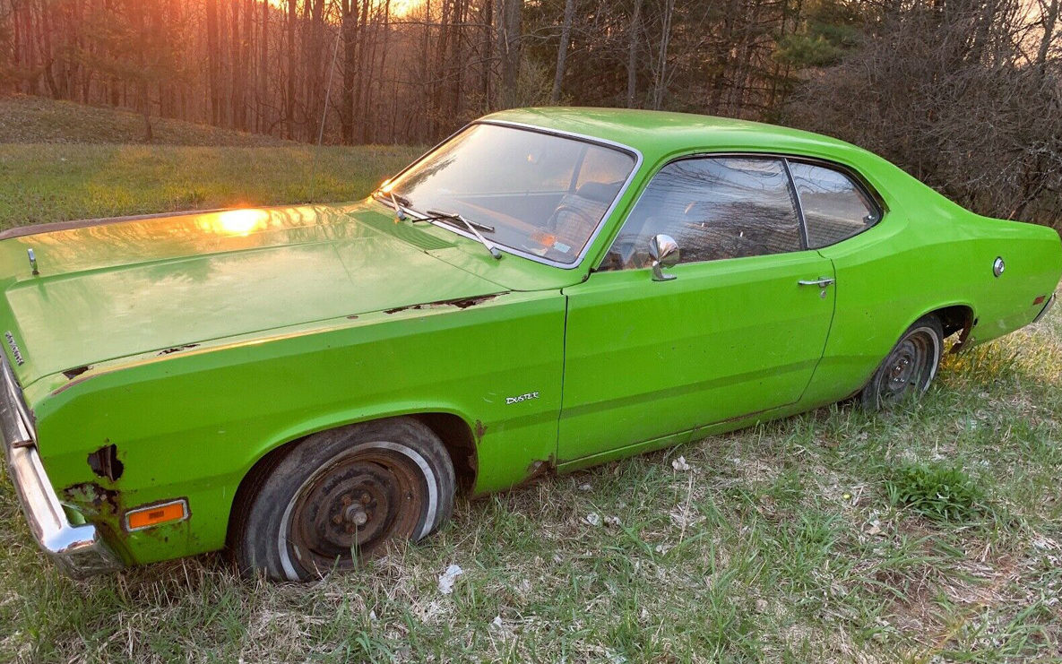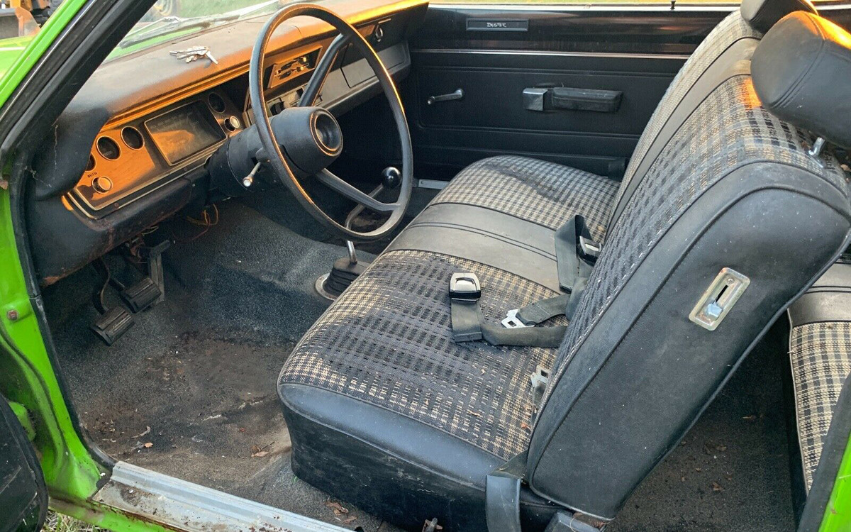 This car has just under 69,000 miles on it and it appears to be a base model, not a 340 or other special edition Duster. Unless it’s been repainted, it seems fairly rare to find one without some sort of stripe or flat black painted area somewhere. In fact, I couldn’t even find a photo of one online in this Sassy Grass color without some sort of stripe or other paint scheme going on, other than this scale model car or this one in an ad with a white stripe.