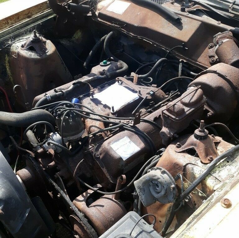 So open shed, that car was forgotten and neglected many years ago. My guess air cleaner assy was left on the ground and hood left open when the carb was taken off. Hinges froze and hood pulled off when it was pulled on the trailer. Shame, car was nice looking car new. Rust is mostly surface but definitely a project. Don’t know if it’s worth saving as is, but worse cars have been back.
