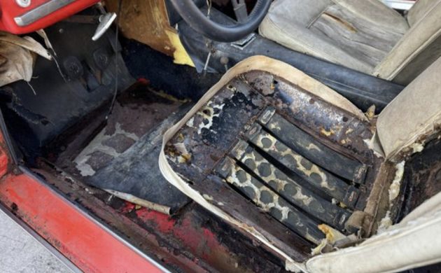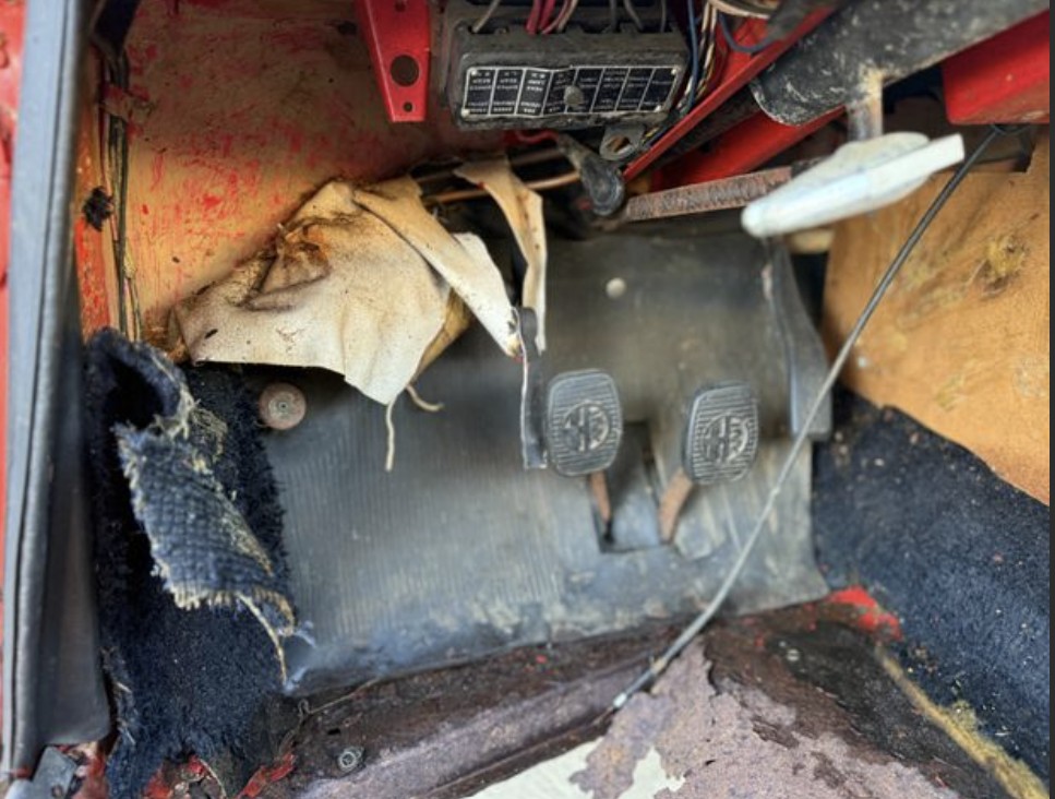 The cabin is a mess! But the gauges, instrument panel, interior trim, e-brake, steering wheel, seats, top frame, and other parts are still present. The pedal box hints at the extent of the corrosion: when sheet metal has turned to sheet rust, it’s impressive.