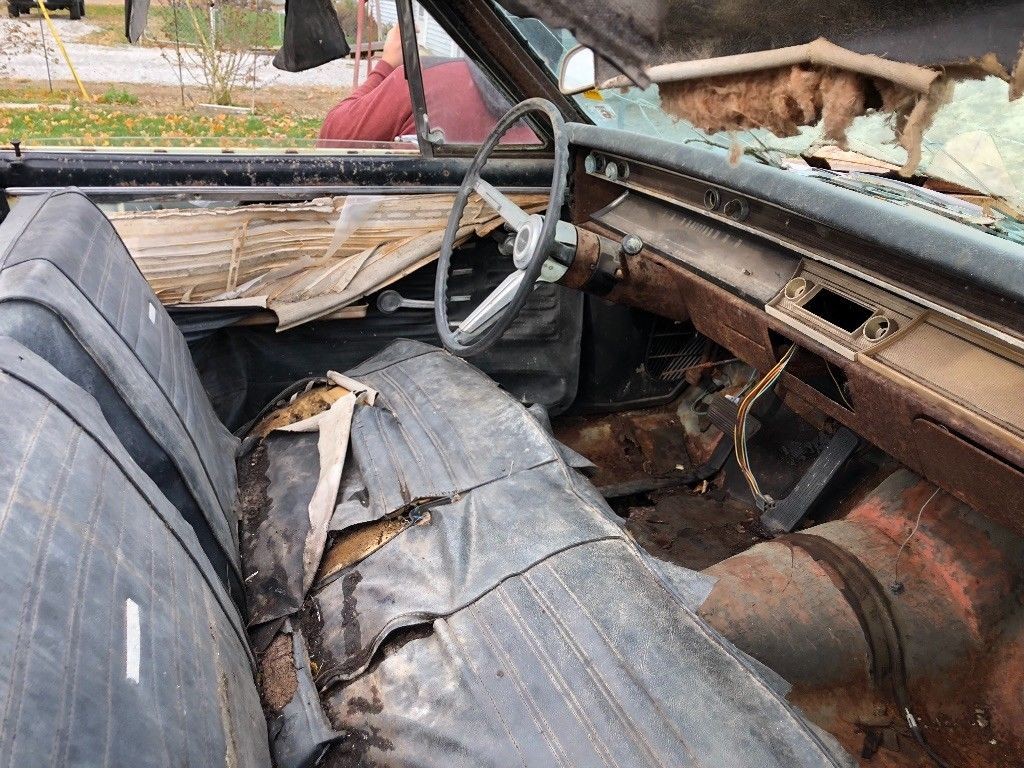 There is an interior, but it is shredded up, rusted up, and full of debris. The dashboard is rusted and there is no radio. Wiring just protrudes from the spot of where it was. Dials are missing, the door trim is falling off, and the floors look frail. Not much is left of the convertible top. The trim and frame seem to be there, but it doesn’t look to be stable. It is hard to see what is salvageable about these parts.
