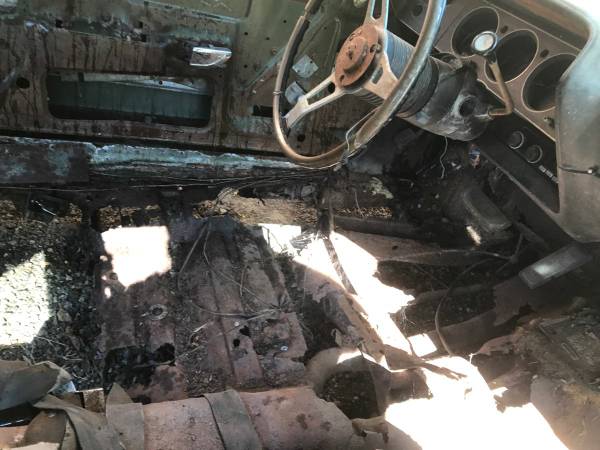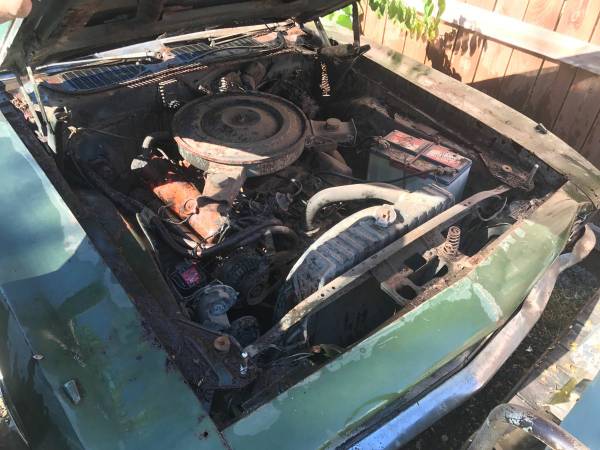 Though very rusty, this is a complete-ish car. According to the seller, it has the original numbers matching engine and transmission, and is one of 600 factory 440 4-barrel ‘Cudas produced in 1970. You’ll notice this isn’t a Six Pack 440, and in the next photo you’ll notice it is an automatic. While the 440 4-barrel option is very cool, it doesn’t bring the money Six Pack or 4-speed equipped ‘Cudas do. After noting the 440 4-barrel, the seller states “one of 16 green – black column shift cars.” While that may be true, unfortunately I’m not sure that it increases the value of this particular vehicle. Because there were so many different options and color combinations available across all Chrysler brands during this time period, the majority of cars produced varied in some way or another and subsequently the majority of 1970s Chrysler products are going to be one of some smaller number of cars produced in that exact color/option combination.