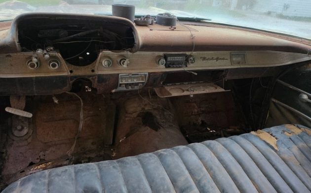 According to this Chevy’s cowl tag, it left the factory wearing a combination of India Ivory over Colonial Cream paint. Some of that remains today when not covered over by corrosion. It was also assembled with a V8 engine that is long gone, along with the transmission. That would have been either a 265 or 283 CI motor, and the listing mentions a manual shifter. But elsewhere in the ad, the seller also references a 350 and an automatic. Since the area under the hood is empty, none of that may matter now.