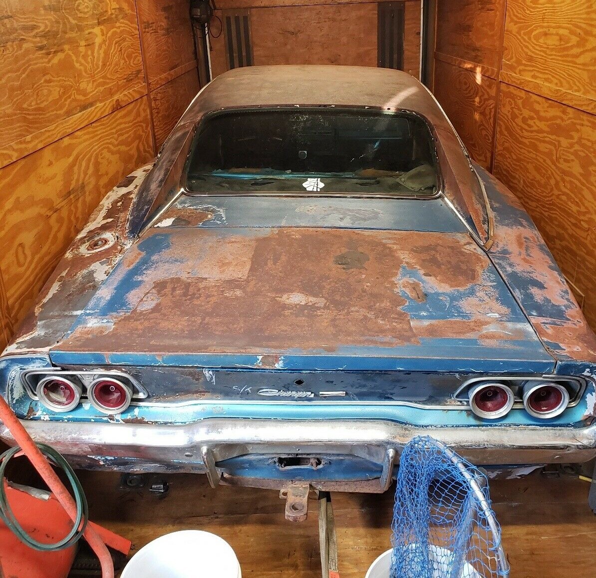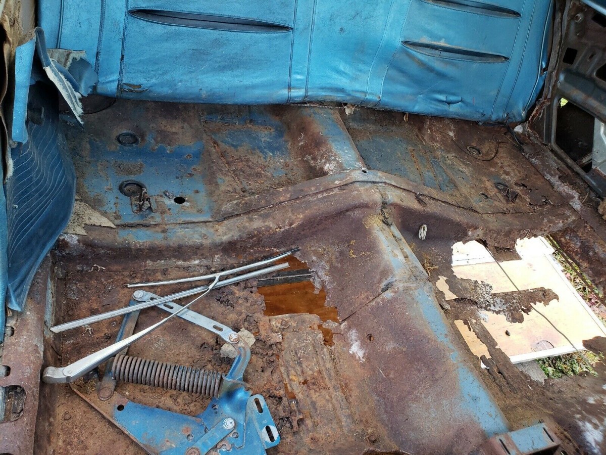 This car appears to have rusted from the inside out, with the floorboards being almost non-existent in the back seat area. The floors will need patching as will the trunk pan and lower quarter panels. One of the rockers is dented and rusted underneath and the overall chassis is crusty most everywhere you look. On the plus side, the seller tells us the frame rails, front torque box, and back window and windshield areas are all good. The blue car once had a vinyl top that has been stripped away.