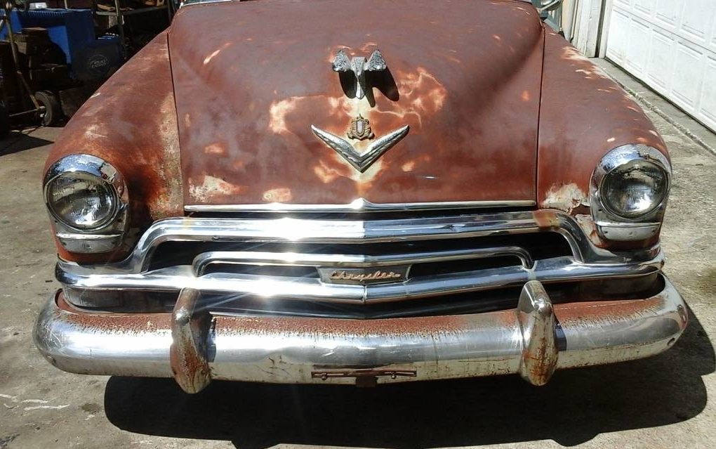 This Chrysler has definitely seen better days, but it may not be as bad as it looks. From the little paint that is left, it looks like it was white. Lets hope there are no major areas that are rusted through and that it’s structurally sound, this would be a good project to make safe to drive, preserve and enjoy. According to the ad, the car is complete, runs great and has 81,000 miles. The owner is letting the car go due to health reasons, that is about all we know from the ad. This is a deluxe model, I think this grill is specific to a deluxe with the center bar over the Chrysler emblem. Most of the trim seems to be on the car or in the trunk with the wheel covers.