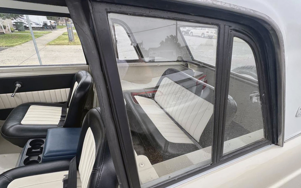 The interior is obviously new, or not factory original. I’d want some sound-deadening material on the floor, and I’d even kick it up a notch with some nice light carpet in this Sportop. The seats look like new because they are. I wish they had gone with a bit less of an eye-popping combo than black and white, but they must like that combination, and with vehicle ownership, that’s all that matters. Our individual opinions are worth exactly zero to anyone but ourselves. We don’t get to see the rear cargo area, but here’s a shot of the back seat through the window.