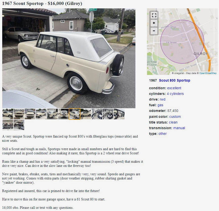 I don’t know how I haven’t been to Gilroy, California before/yet. The famous garlic capital of the U.S. has to be worth a visit. If I had an extra $16,000, I’d visit to buy this Scout and drive it home on two-lane roads. I would never drive a vehicle this nice on salty roads in the winter, so the fact that it isn’t a 4×4 doesn’t even enter into the equation for me.