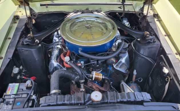 The seller’s Marti Report confirms this Mustang was finished in Lime Gold paint, which is probably original. And the black bucket seat interior is mostly okay, though the carpet has faded a lot in nearly six decades. The Ford left the road around 1985 and has been in storage, at least since the seller (the son?) took it over in the early 1990s. We’re told it’s a running, driving project that has had some work done, but more remains.